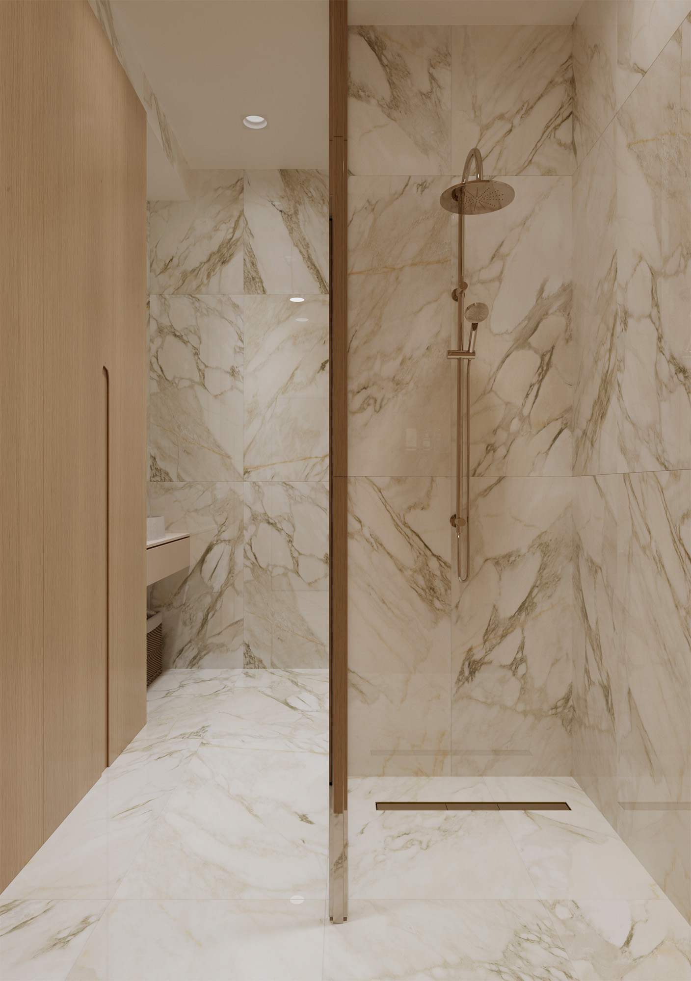 Материал с эффектом «мрамор» в оттенке «белый с бежевым» подойдет для практичной и долговечной отделки, а также для современных интерьеров.