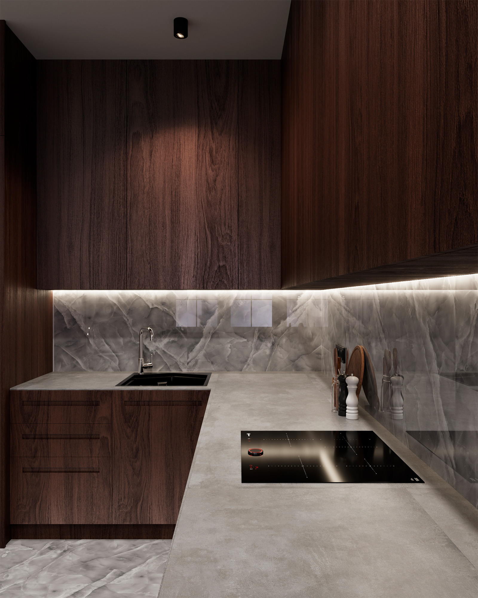 Материал с эффектом «оникс» в оттенке «серый» подойдет для практичной и долговечной отделки, а также для современных интерьеров.