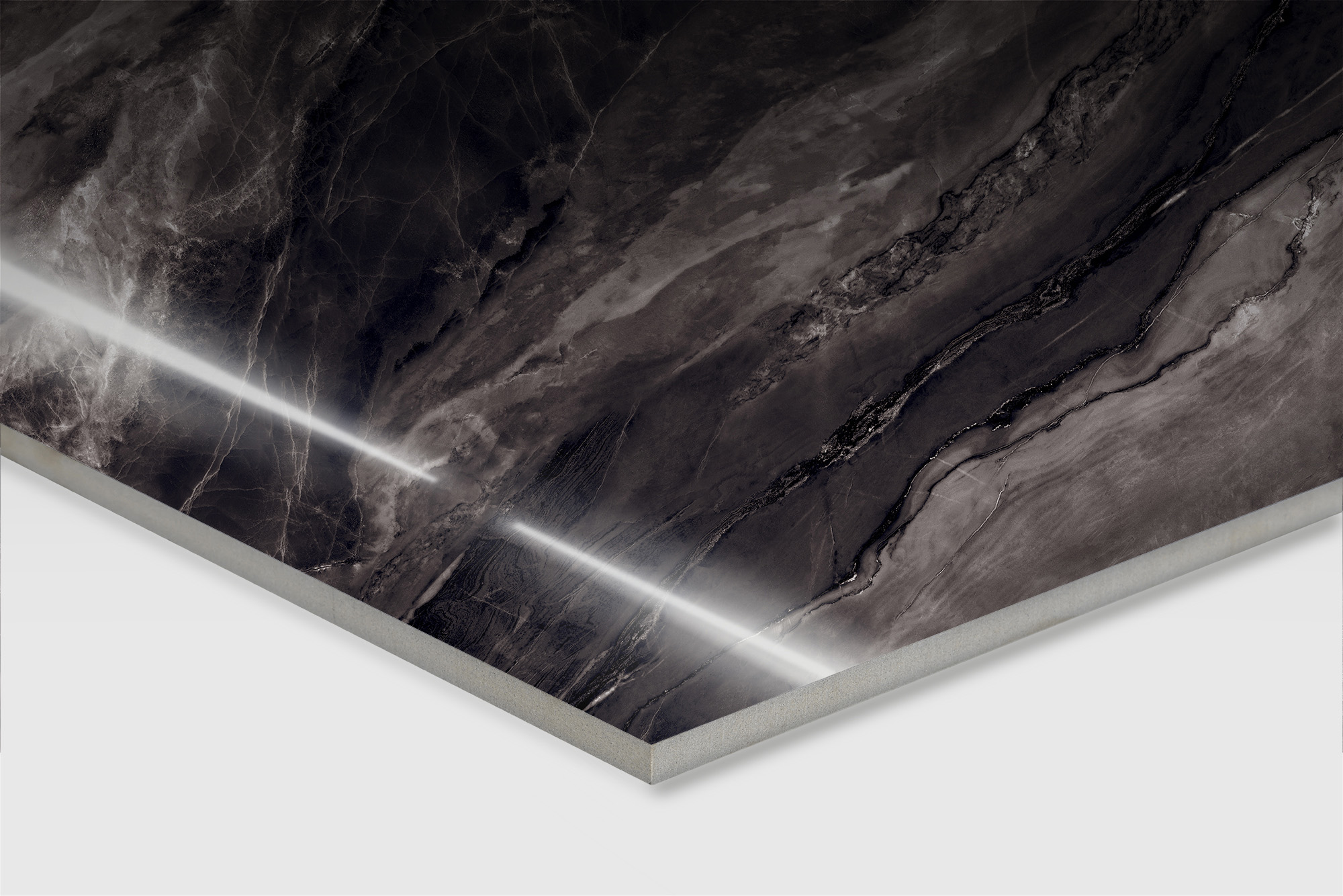 Материал с эффектом «мрамор» в оттенке «черный» подойдет для практичной и долговечной отделки, а также для современных интерьеров.