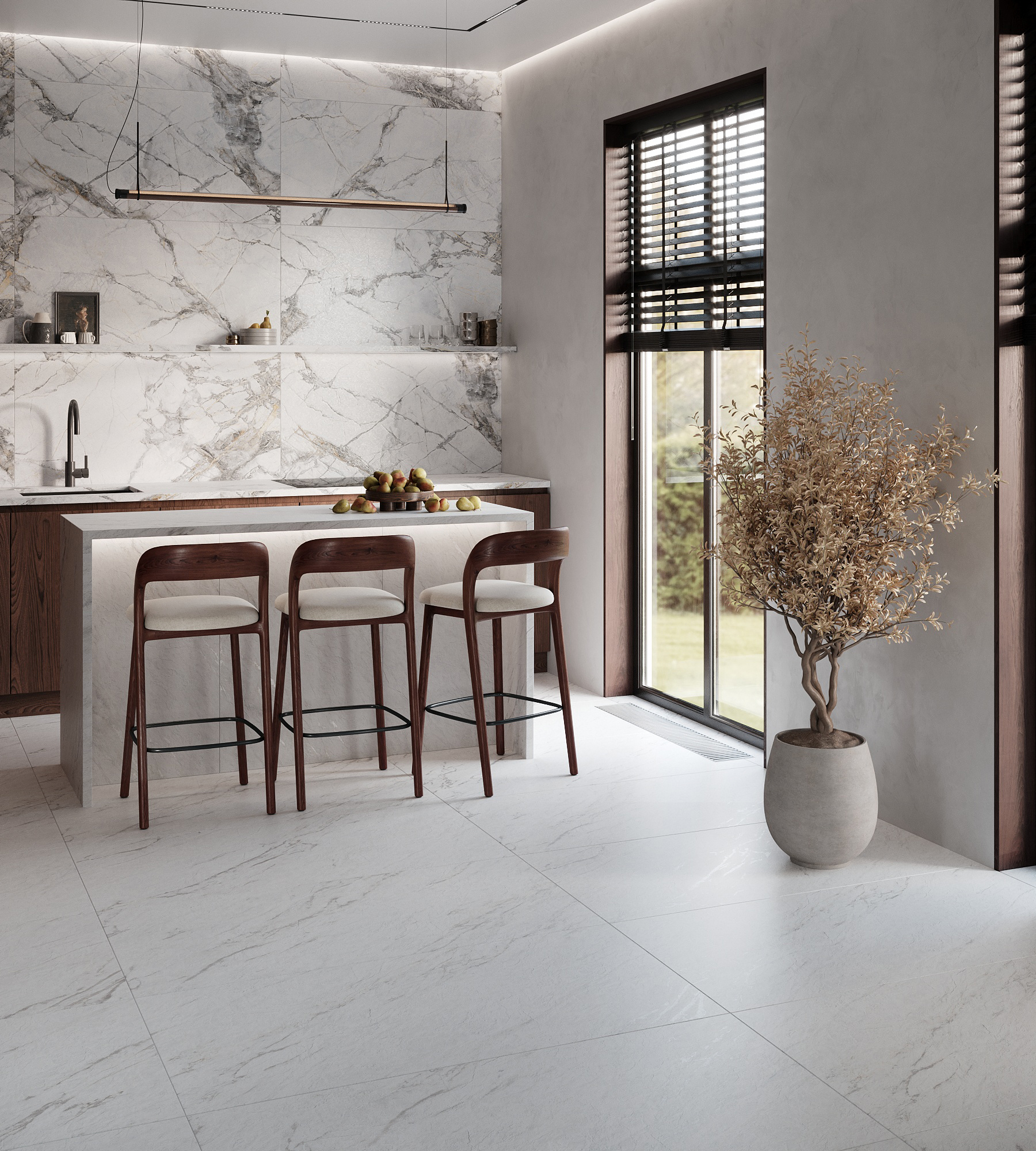 Керамогранит LAZIO BIANCO светлого оттенка с имитацией мрамора привлекает внимание своим элегантным дизайном. Природные прожилки, контрастно переплетаясь, добавляют визуальную динамику и делают каждую плитку настоящим произведением искусства. Матовая рельефная поверхность с эффектом металлизации добавляет глубину и объем любому помещению. При разном освещении керамогранит играет светом, создавая уникальные визуальные акценты, которые способны преобразить пространство. Он легко комбинируется с различными материалами, такими как дерево, стекло или металл, что позволяет создавать интересные и современные решения в интерьере. LAZIO BIANCO прекрасно смотрится как в классическом, так и в современном интерьере. Нейтральная цветовая гамма позволяет подчеркивать детали декора, а также активно использовать его в качестве фона для ярких элементов. Такой керамогранит способен стать настоящей изюминкой любого дизайна, подчеркивая индивидуальность и вкус владельца. Тон и калибр плитки может отличаться. Тон плитки — цветовой нюанс определенной партии продукции. Расцветки и эстетические характеристики керамогранита на экране монитора могут отличаться от реального. Указанные на сайте размеры (калибр плитки) — номинальные. Фактический размер плитки будет отклоняться от номинального в пределах определенного калибра, как в меньшую, так и в большую сторону.