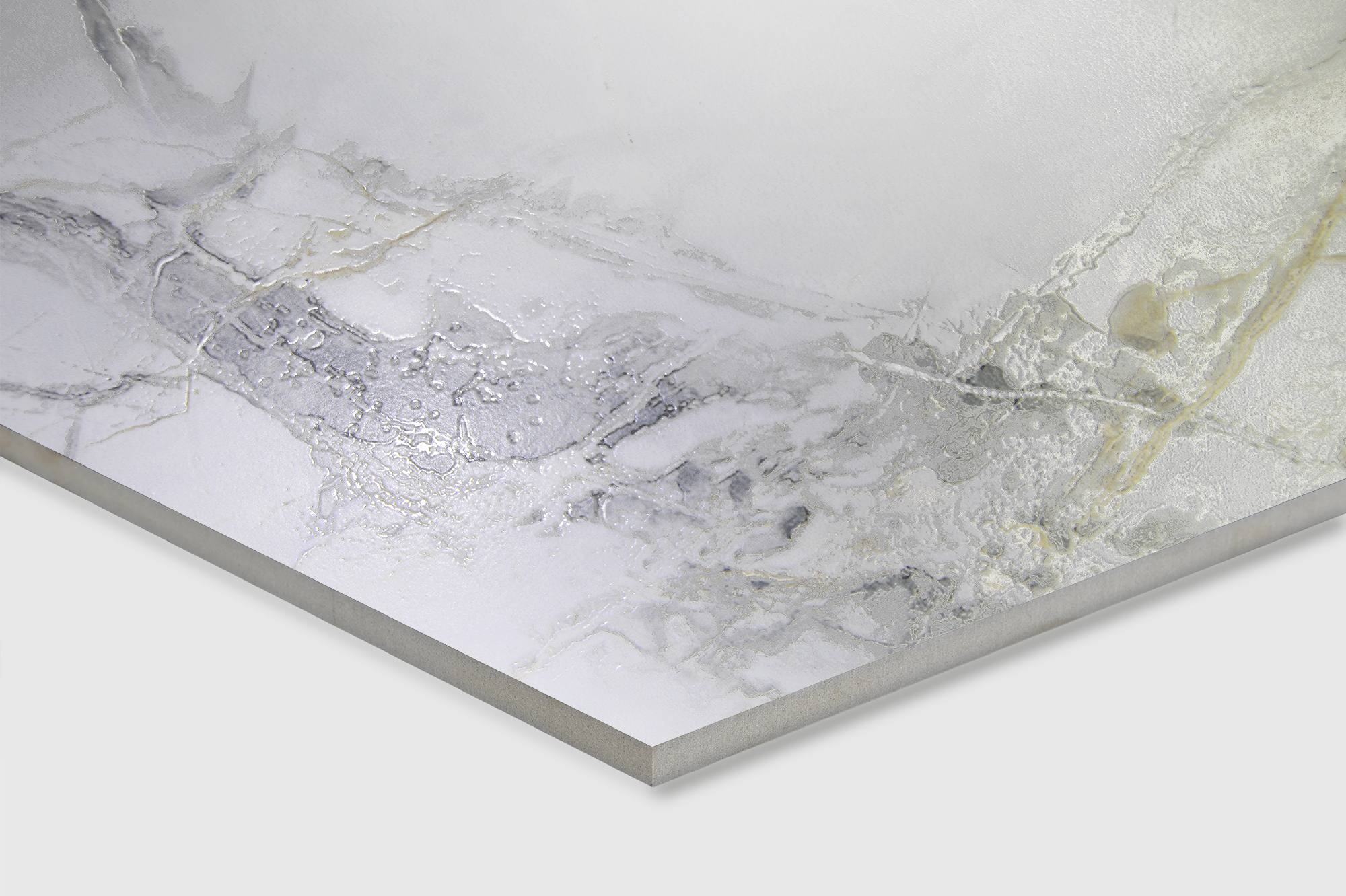 Материал с эффектом «мрамор» в оттенке «белый с серым» подойдет для практичной и долговечной отделки, а также для современных интерьеров.