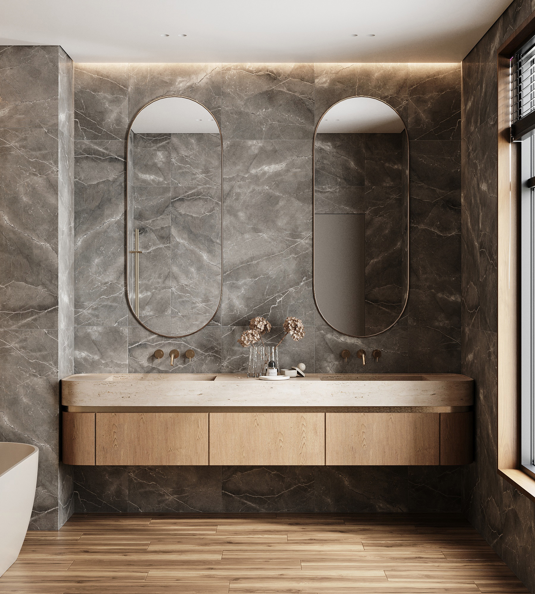 Материал с эффектом «камень» в оттенке «серый» подойдет для практичной и долговечной отделки, а также для современных интерьеров.