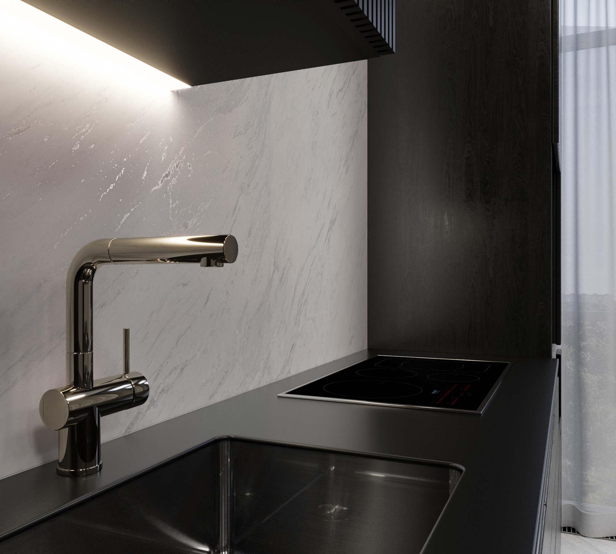 Материал с эффектом «мрамор» в оттенке «белый» подойдет для практичной и долговечной отделки, а также для современных интерьеров.